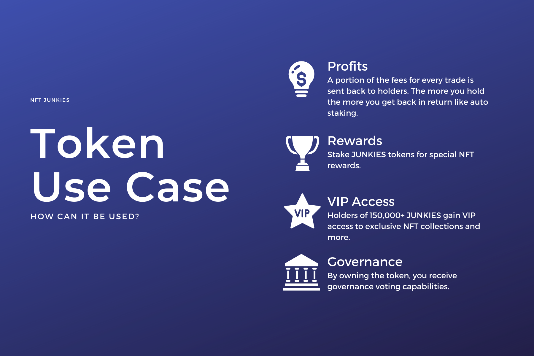 Our token has four primary use cases that allow users extra earning, staking, vip access and governance rights.