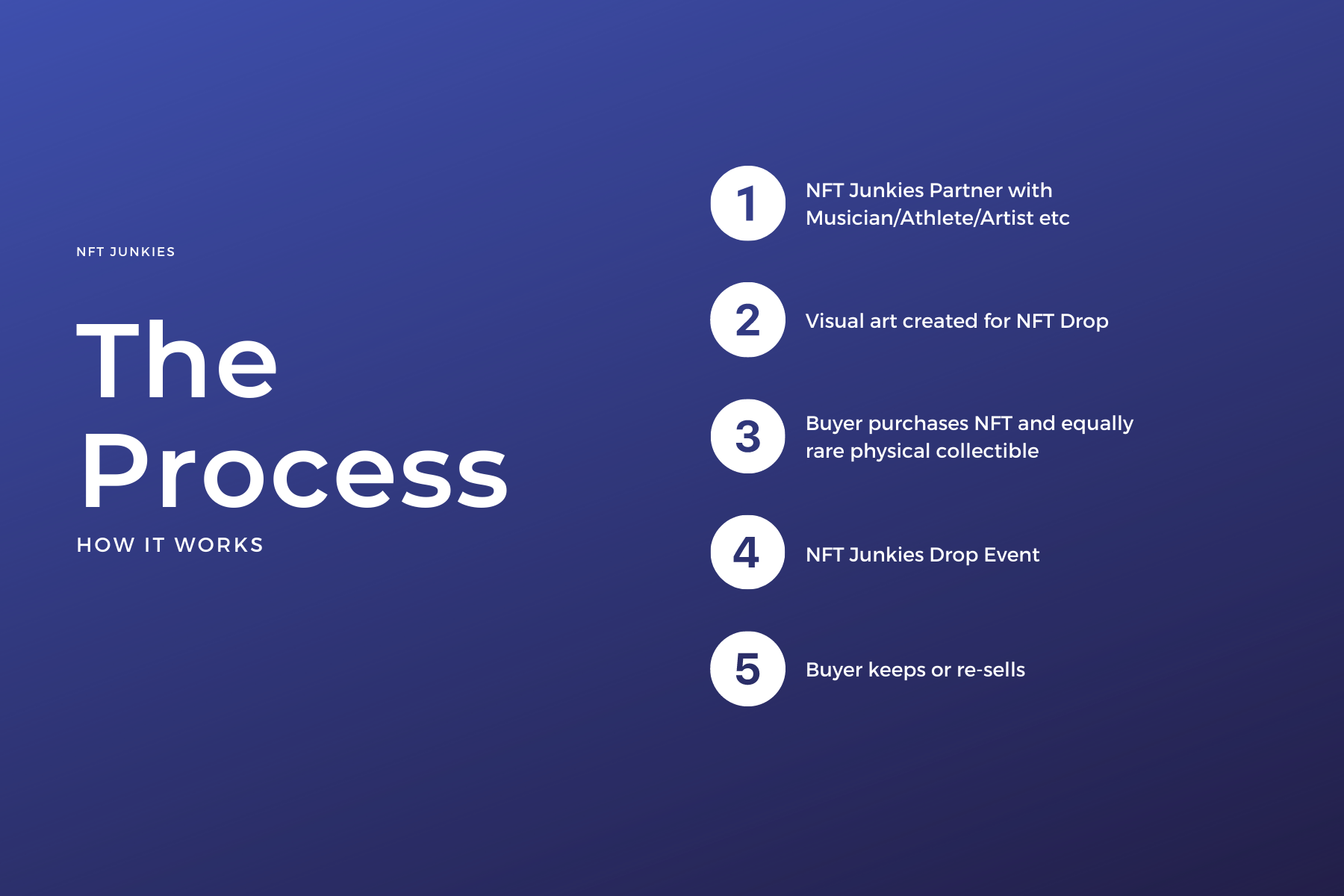 Our 5-step process will eventually create a plattform where buyers get both, NFT drops and physical delivery.